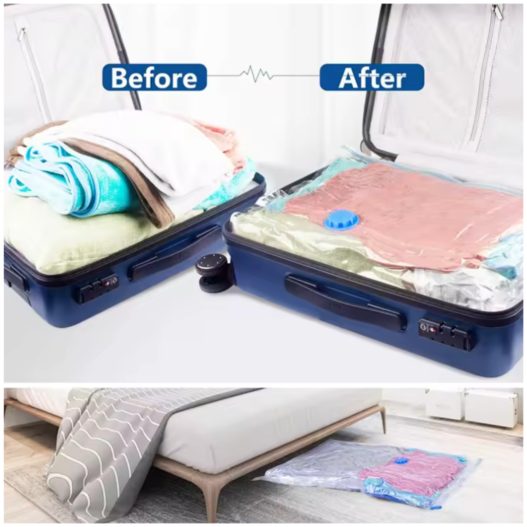 ¡Ahorra hasta un 80% de espacio en tu hogar con este práctico set de bolsas al vacío! Ideal para guardar ropa, cobijas, edredones, toallas y mucho más, protegiendo tus pertenencias del polvo, la humedad, los insectos y los malos olores.