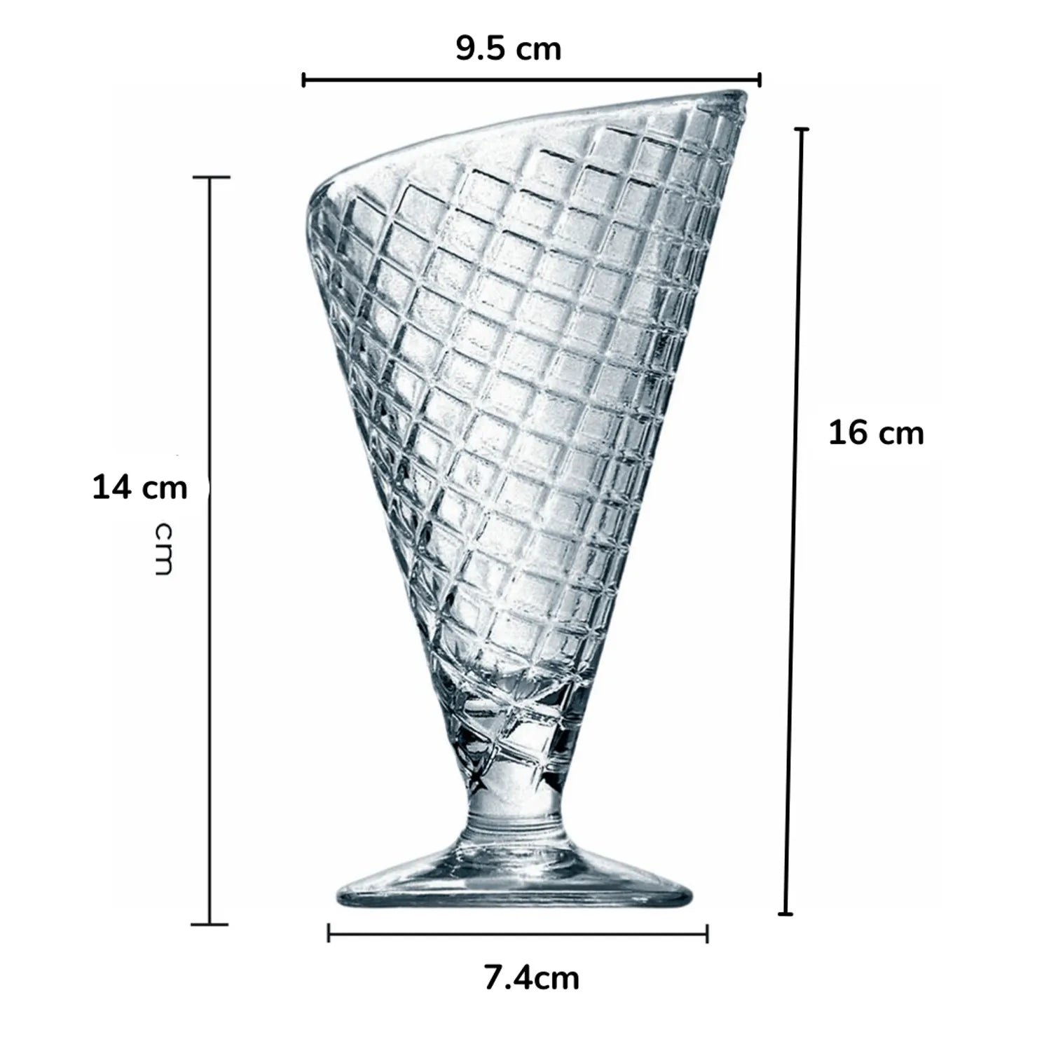 Este set de copas de vidrio es perfecto para servir y disfrutar de helados, postres con un diseño elegante y sofisticado. Su estructura en forma de cono con relieve tipo diamante aporta un toque decorativo y refinado a la mesa, haciéndolas perfectas para cualquier ocasión especial o el uso diario.