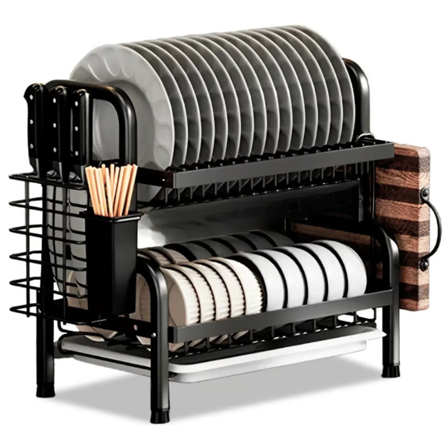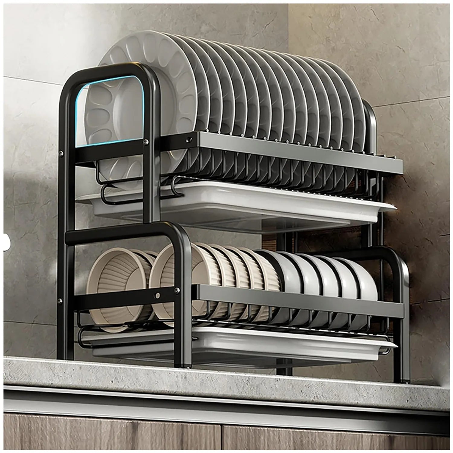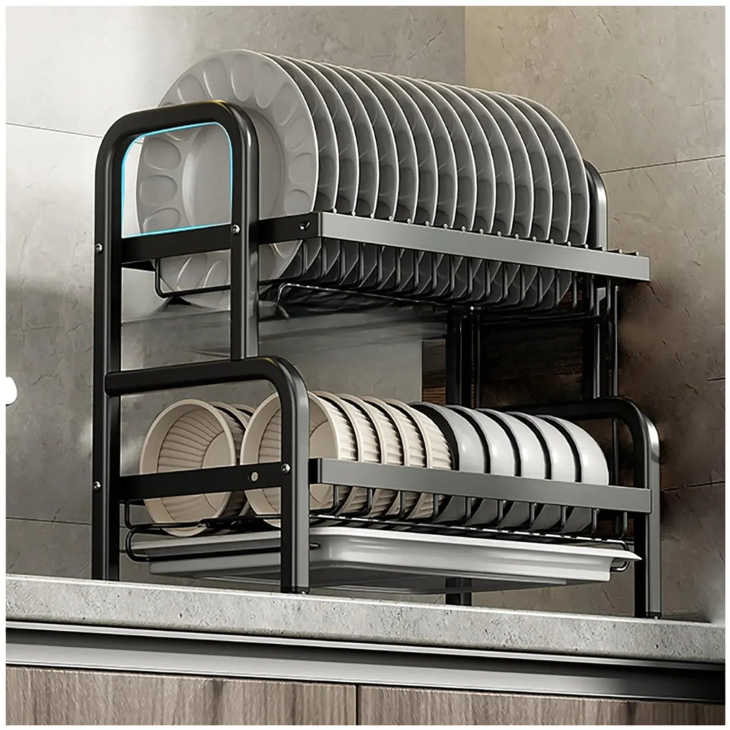 - Diseño de 2 Niveles: Ofrece amplio espacio para organizar platos, tazas, vasos y utensilios, maximizando el uso del espacio vertical.