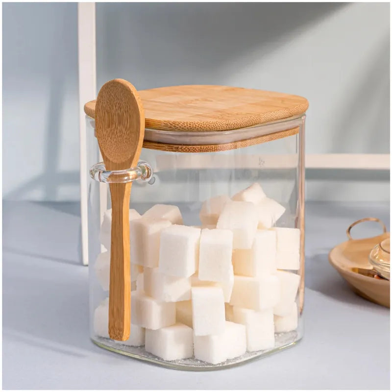 Frasco de almacenamiento de vidrio con forma cuadrada, acompañado de tapa y cucharita estilo bambú. Su diseño moderno y natural es ideal para organizar y conservar alimentos secos como azúcar, sal, café, té o especias. Combina practicidad con un estilo decorativo que realza cualquier espacio de cocina.