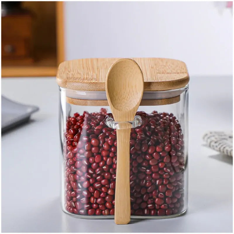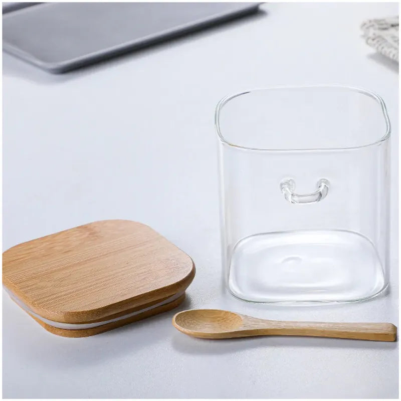 Frasco de almacenamiento de vidrio con forma cuadrada, acompañado de tapa y cucharita estilo bambú. Su diseño moderno y natural es ideal para organizar y conservar alimentos secos como azúcar, sal, café, té o especias. Combina practicidad con un estilo decorativo que realza cualquier espacio de cocina.