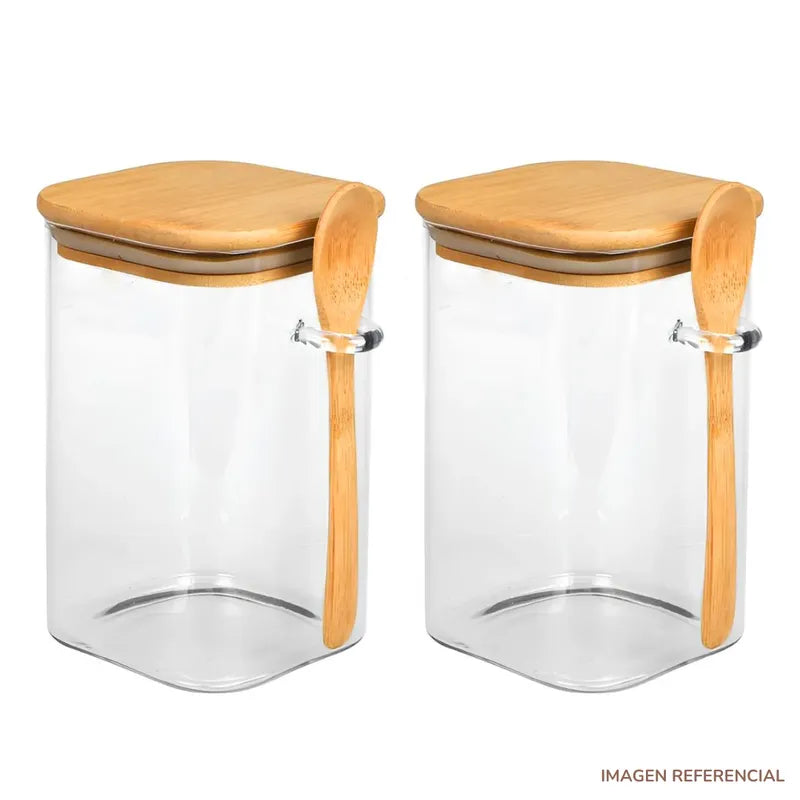Frasco de almacenamiento de vidrio con forma cuadrada, acompañado de tapa y cucharita estilo bambú. Su diseño moderno y natural es ideal para organizar y conservar alimentos secos como azúcar, sal, café, té o especias. Combina practicidad con un estilo decorativo que realza cualquier espacio de cocina.