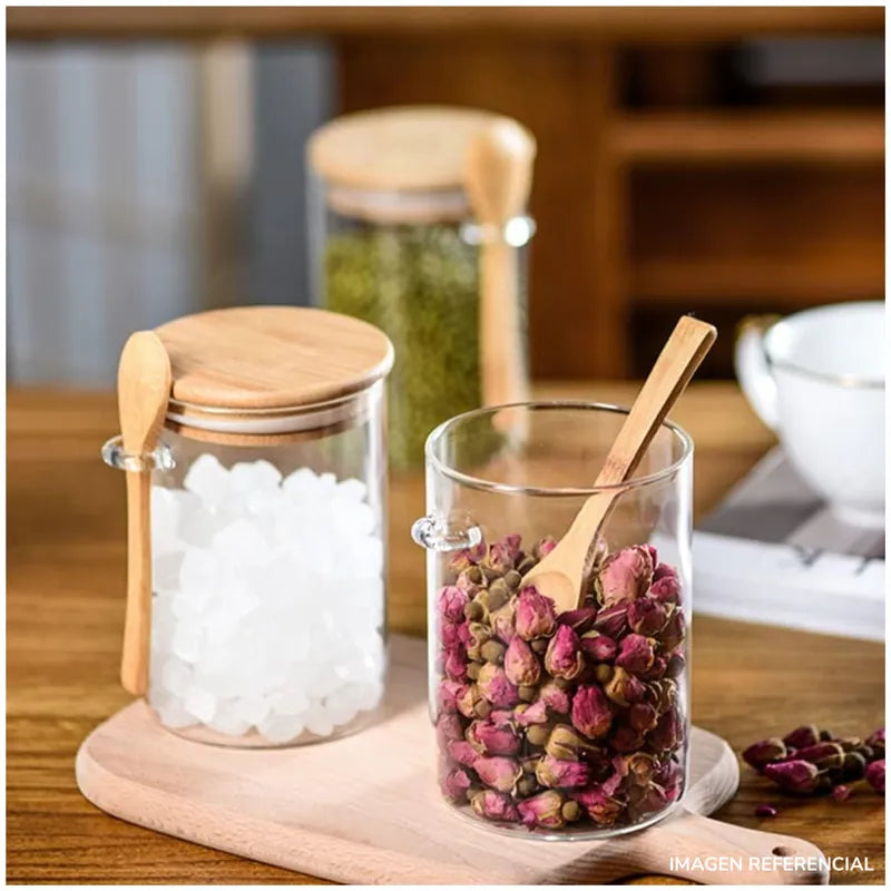 Frasco de almacenamiento de vidrio transparente, con tapa y cucharita de diseño tipo bambú. Su forma circular y materiales naturales lo hacen ideal para conservar y presentar condimentos, especias, azúcar, café o té de manera práctica y elegante. Perfecto para el hogar, cocina o uso decorativo.
