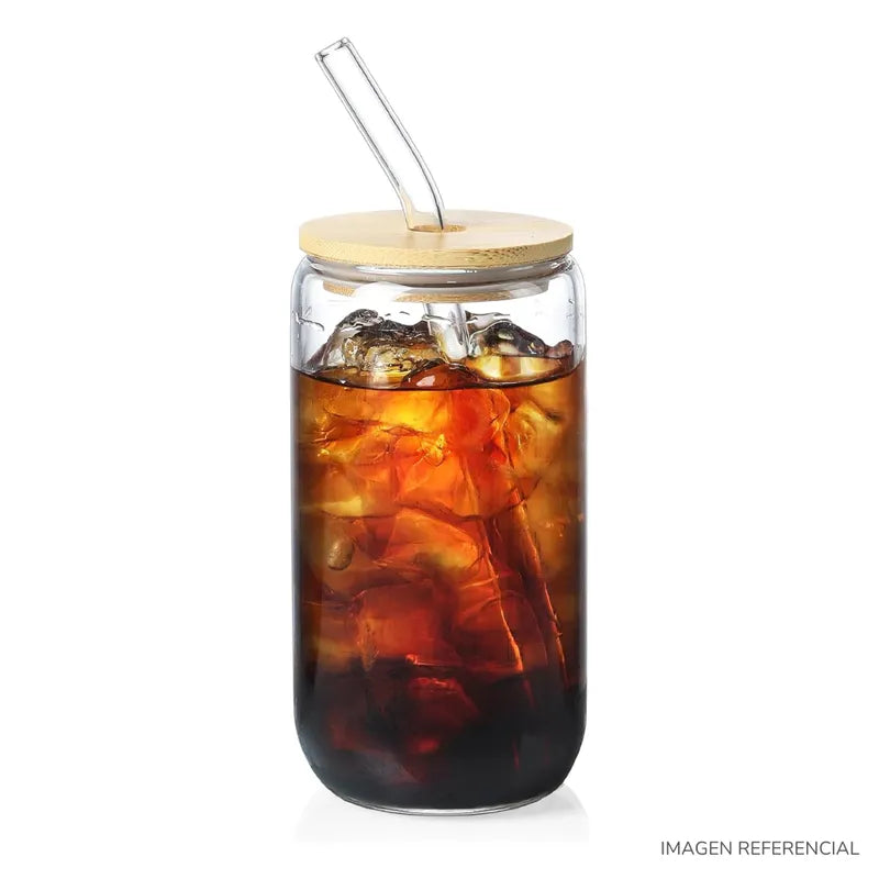 Frasco de vidrio transparente con sorbete, diseñado para ofrecer una experiencia práctica y estilizada al momento de disfrutar bebidas. Su material de vidrio garantiza durabilidad, y el sorbete integrado permite disfrutar cómodamente de las bebidas sin necesidad de utensilios adicionales.