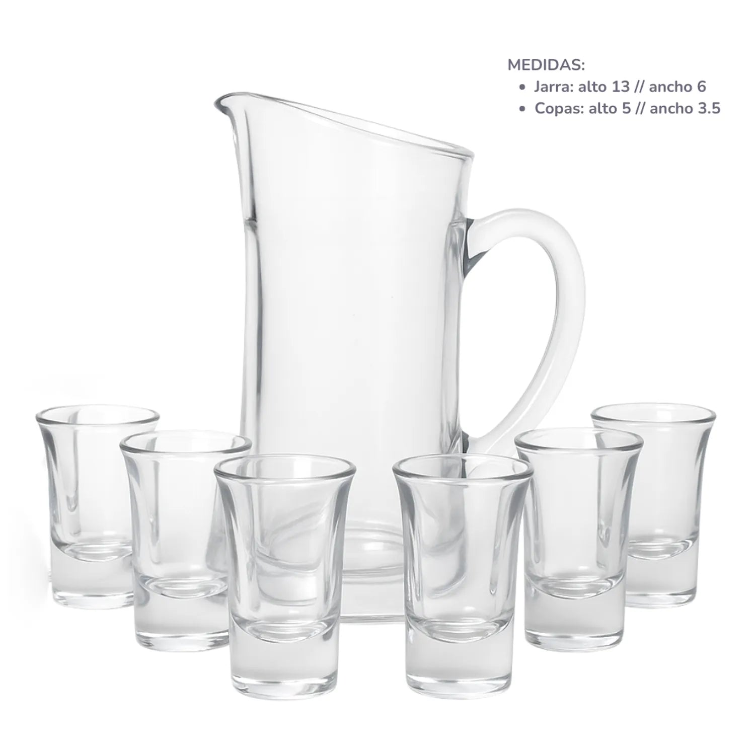 Set de jarra con mini copas de shot en vidrio, ideal para compartir tus bebidas favoritas con estilo. Perfecto para reuniones, regalos o decoración.