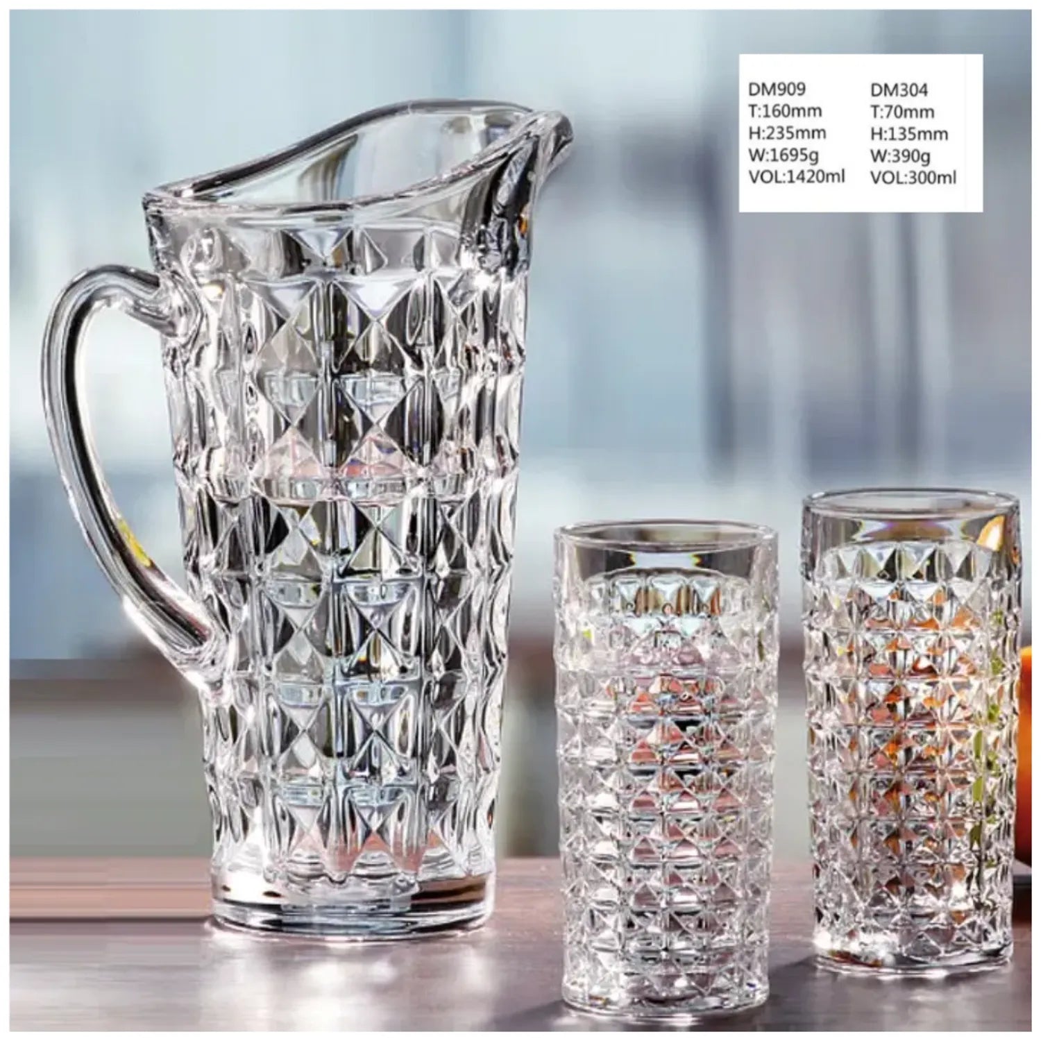 - Diseño Exclusivo: La jarra presenta un patrón de diamantes grabados que capturan y reflejan la luz, creando un efecto visual deslumbrante que realza la presentación de tus bebidas.
